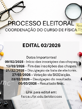 A Comissão Eleitoral do Curso de Graduação em Física do Centro de Ciências da Natureza da Universidade Federal do Piauí torna público o processo eleitoral para escolha do(a) Coordenador(a) e do(a) Subcoordenador(a) do curso, referente ao biênio 2026–2028, conforme o Edital nº 02/2026, de 04 de fevereiro de 2026.