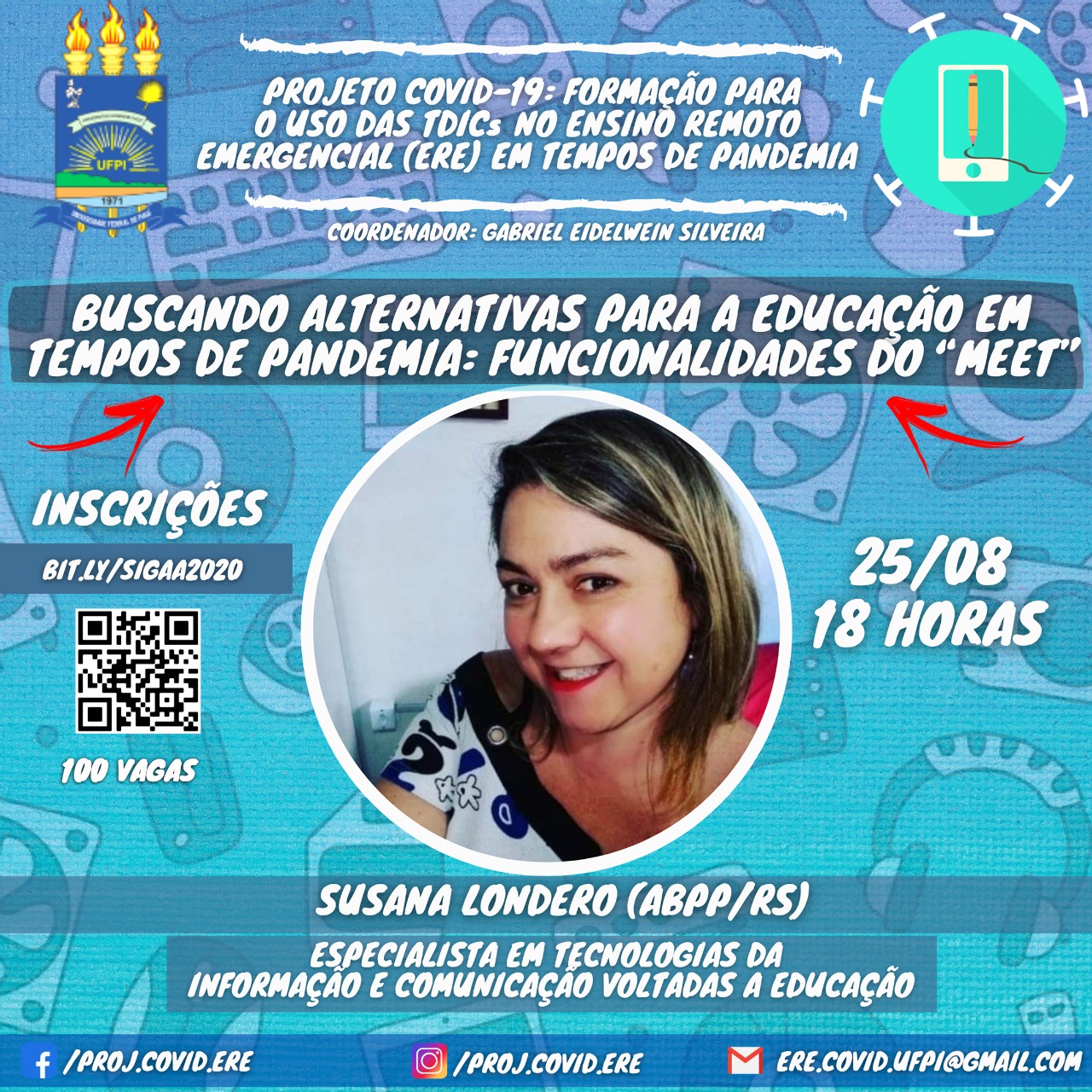 O primeiro evento do Projeto será na próxima terça-feira (25/8), às 18h, com a Oficina "Buscando alternativas para a educação em tempos de pandemia: funcionalidades do Meet", com a professora Susana Londero.