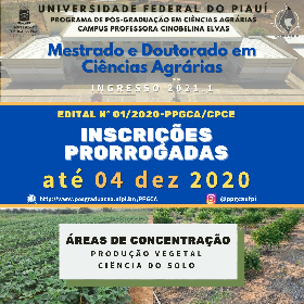 ADITAMENTO DO EDITAL N° 01/2020-PPGCA/CPCE (PROGRAMA DE PÓS-GRADUAÇÃO EM ACIÊNCIAS AGRÁRIAS) ADITAMENTO AO EDITAL DE SELEÇÃO PARA O DO PROGRAMA DE PÓS-GRADUAÇÃO EM CIÊNCAIS AGRÁRIAS (PPGA) – PRORROGAÇÃO DO PRAZO DE INSCRIÇÕES E ALTERAÇÃO DO CRONOGRAMA. A Universidade Federal do Piauí (UFPI), através da Coordenação do Programa de PósGraduação em Ciências Agrárias (PPGCA) do Campus Professora Cinobelina Elvas (CPCE) e da Pró-Reitoria de Ensino de Pós-Graduação (PRPG), torna público e estabelece novo prazo de inscrições de candidatos e altera o cronograma se seleção ficando o prazo de extensão estendido para até o dia 04/12/2020, conforme o cronograma ajustado a seguir.