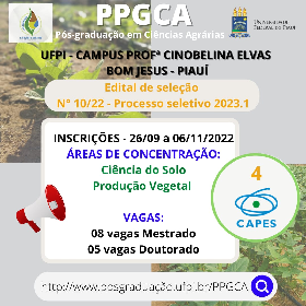 A Universidade Federal do Piauí (UFPI), por meio da Pró-Reitoria de Ensino de Pós-Graduação (PRPG), da Diretoria do Campus Professora Cinobelina Elvas (CPCE) e da Coordenação do Programa de Pós-Graduação em Ciências Agrárias (PPGCA), no uso de suas atribuições, torna pública para conhecimento dos interessados a abertura das inscrições e realização de seleção para preenchimento de 08 (oito) vagas para o Curso de Mestrado e 05 (cinco) vagas para o Curso de Doutorado, totalizando 13 (treze) vagas, distribuídas em duas áreas de concentração: 1 - Ciência do Solo e 2 - Produção Vegetal, conforme discriminado no ANEXO IV do Edital PPGCA/UFPI Nº 10, DE 23 DE SETEMBRO DE 2022.