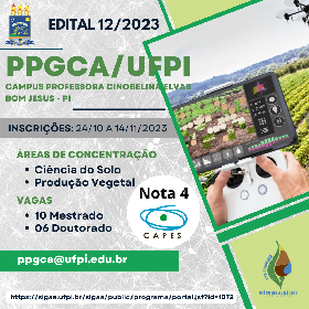 A Universidade Federal do Piauí (UFPI), por meio da Pró-Reitoria de Ensino de Pós-Graduação (PRPG), da Diretoria do Campus Professora Cinobelina Elvas (CPCE) e da Coordenação do Programa de Pós-Graduação em Ciências Agrárias (PPGCA), no uso de suas atribuições, torna pública para conhecimento dos interessados a abertura das inscrições e realização de seleção para preenchimento de 10 (dez) vagas para o Curso de Mestrado e 06 (seis) vagas para o Curso de Doutorado, totalizando 16 (dezesseis) vagas, distribuídas em duas áreas de concentração: 1 - Ciência do Solo e 2 - Produção Vegetal, conforme discriminado no ANEXO IV do Edital.