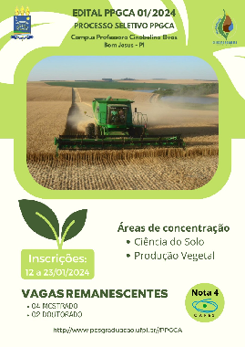 A Universidade Federal do Piauí (UFPI), por meio da Pró-Reitoria de Ensino de Pós-Graduação (PRPG), da Diretoria do Campus Professora Cinobelina Elvas (CPCE) e da Coordenação do Programa de Pós-Graduação em Ciências Agrárias (PPGCA), no uso de suas atribuições, torna pública para conhecimento dos interessados a abertura das inscrições e realização de seleção para preenchimento de 04 (quatro) vagas para o Curso de Mestrado e 02 (duas) vagas para o Curso de Doutorado, totalizando 06 (seis) vagas, distribuídas em duas áreas de concentração: 1 - Ciência do Solo e 2 - Produção Vegetal, conforme discriminado no ANEXO IV do Edital.