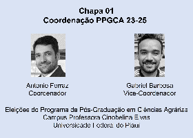 A Comissão Eleitoral instituída pela Portaria DIREÇÃO CPCE/UFPI N° 047/2023, DE 11 de 11 de janeiro de 2023 – Direção CPCE/UFPI, no uso de suas atribuições legais, torna pública a homologação de inscrição da candidatura da chapa “Coordenação PPGCA 23-25”, formada pelo Prof. Dr. Antonio Carlos Ferraz Filho (Coordenador) e Prof. Dr. Gabriel Barbosa da Silva Júnior (Vice-Coordenador), para o Programa de Pós-Graduação em Ciências Agrárias (PPGCA).