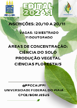 O Programa de Pós-Graduação em Ciências Agrárias (PPGCA) da Universidade Federal do Piauí (UFPI), Campus Professora Cinobelina Elvas, torna público o Edital nº 08/2025 referente à seleção de candidatos para os cursos de Mestrado e Doutorado Acadêmico, com ingresso para o primeiro semestre letivo de 2026.
