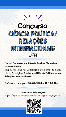 O Reitor da Universidade Federal do Piauí (UFPI), de acordo com o que estabelecem a Portaria ME Nº 10.041, de 18 de agosto de 2021, o Decreto Federal Nº 9.739, de 28 de março de 2019, o Art. 66 da Lei Nº 9.394/96 (LDBEN), o Decreto Federal Nº 8.259, de 29 de maio de 2014, a Lei Nº 12.772, de 28 de dezembro de 2012, a Lei Nº 12.863, de 24 de setembro de 2013, o Art. 48 do Estatuto da UFPI, a Resolução Nº 135 CONSUN/UFPI, de 21 de agosto de 2023, e suas alterações, a Portaria Interministerial MEC/MPOG Nº 405, de 30 de agosto de 2012, e a Portaria MEC Nº 243, de 22 de março de 2013, Instrução Normativa MGI Nº 23, de 25 de julho de 2023, torna público que estarão abertas inscrições para 11 (onze) áreas epistemológicas para provimento de 11 (onze) vagas docentes, e formação de cadastro de reserva, referentes à carreira do Magistério Superior, existentes nos Campi Ministro Petrônio Portella, na capital Teresina, Professora Cinobelina Elvas, na cidade de Bom Jesus-PI e, Campus Senador Helvídio Nunes de Barros, na cidade de Picos-PI.