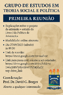 O Grupo de Estudos em Teoria Social e Política convida toda a comunidade acadêmica e interessados(as) em filosofia e ciência política para participar de sua primeira reunião.