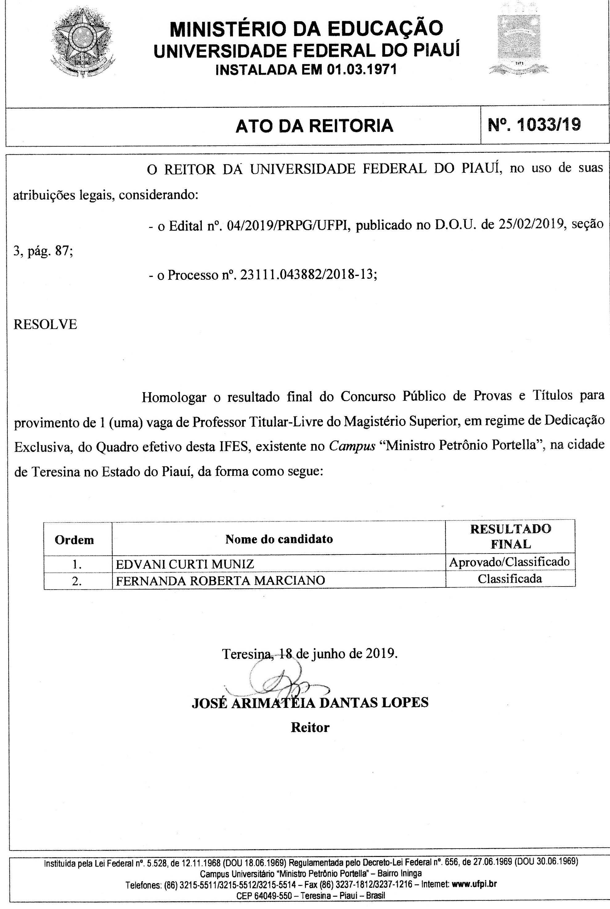 Foi homologado o resultado final do Concurso Público para provimento de uma vaga de Professor Titular-Livre do Magistério Superior, em regime de Dedicação Exclusiva, para o quadro efetivo desta IFES, campus "Ministro Petrônio Portela".