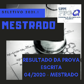 A Coordenação do Programa de Pós-Graduação em Química torna público, o resultado da prova escrita do Edital 04/2020/PPGQ/UFPI – 2021.1 – Mestrado.