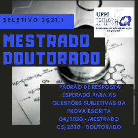 A Coordenação do Programa de Pós-Graduação em Química torna público, o padrão de resposta esperado das questões subjetivas da prova escrita dos Editais 04/2020/PPGQ/UFPI – 2021.1 – Mestrado e 05/2020/PPGQ/UFPI – 2021.1 – Doutorado