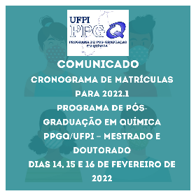 CRONOGRAMA DE MATRÍCULAS PARA 2022.1 PROGRAMA DE PÓS-GRADUAÇÃO EM QUÍMICA PPGQ/UFPI - MESTRADO E DOUTORADO DIAS 14, 15 e 16 de fevereiro de 2022