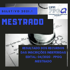 A Coordenação do Programa de Pós-Graduação em Química torna público o resultado dos recursos das incrições indeferidas, Edital 04/2020/PPGQ/UFPI – 2021.1 – Mestrado.