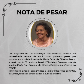 O Programa de Pós-Graduação em Políticas Públicas da Universidade Federal do Piauí,com profundo pesar que comunicamos o falecimento de Maria Dalva de Oliveira Passos, ocorrido no dia 09 de dezembro de 2024. Maria Dalva era mãe da querida Profa. Dra. Guiomar de Oliveira Passos, ex-professora do PPGPP.