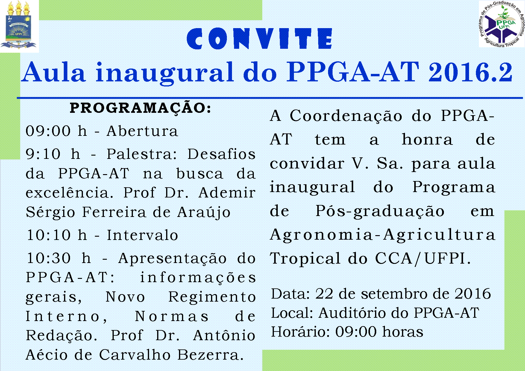Convite do Programa de Pós-graduação em Agronomia - Agricultura Tropical para aula inaugural do segundo período de 2016 que será realizada no dia 22 de setembro de 2016 no auditório da Pós-graduação do CCA às 9:00 horas.