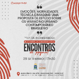 O Programa de Pós-Graduação em Antropologia da UFPI promove nesta quinta (29), às 17h30, no Auditório I da Pós-Graduação - Bloco C - CCHL/UFPI, mais uma edição do Encontros do PPGAnt com a palestra "Emoções, moralidades, técnica e imagens: uma proposta de estudo sobre os Warao no urbano contemporâneo brasileiro". A palestra será ministrada pelo professor Raoni Barbosa, doutor em Antropologia pela Universidade Federal de Pernambuco.