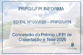A Pró-Reitoria de Pós-Graduação (PRPG), através do edital nº 03/2020, tornou público o certame para concessão do Prêmio UFPI de Dissertações e Teses 2020. O prêmio objetiva reconhecer os melhores trabalhos desenvolvidos nos programas de pós-graduação da instituição, contribuindo, dessa forma, para a autoavaliação institucional e estímulo à difusão de novos conhecimentos.