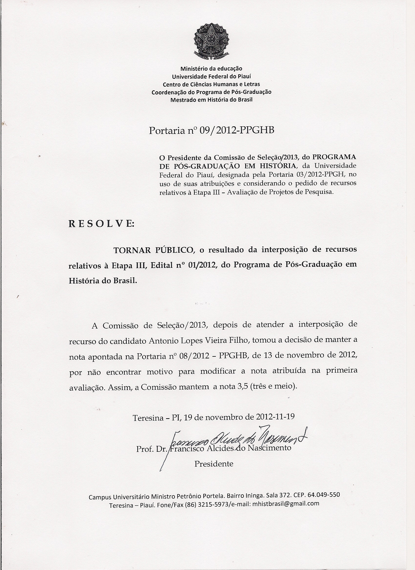 A Coordenação do PPGHB divulga o resultado dos recursos apresentados em relação a III Etapa- Avaliação dos Projetos para seleção 2013