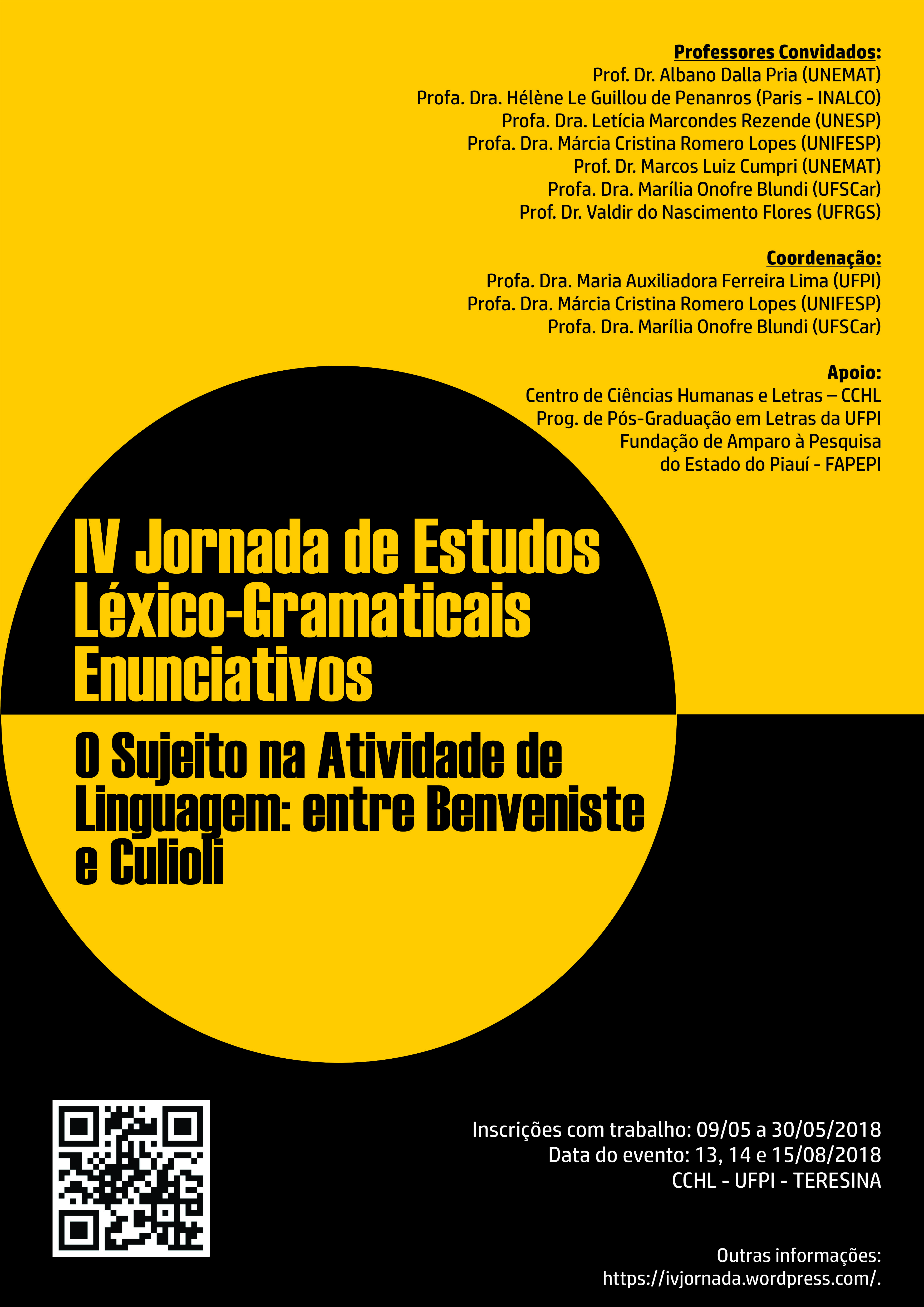 Nos dias 13, 14 e 15 de agosto de 2018 será realizada a IV Jornada de Estudos Léxico-Gramaticais Enunciativos. Nessa edição temos como temática: o sujeito na atividade de linguagem:entre Benveniste e Culioli.