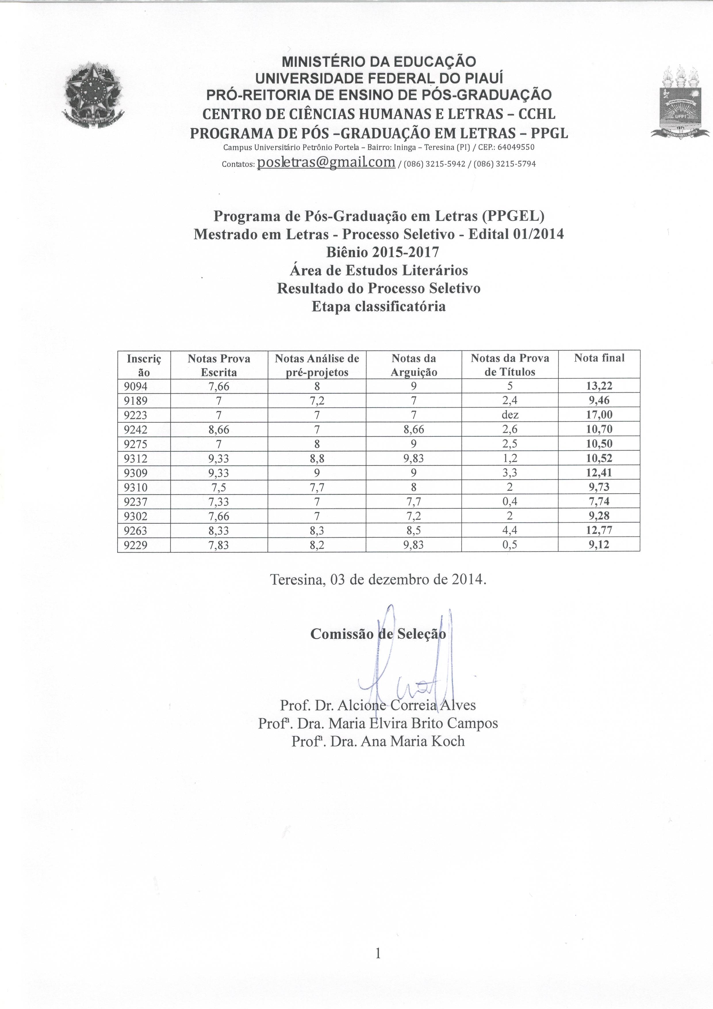 Resultado do processo seletivo da área de Estudos literários