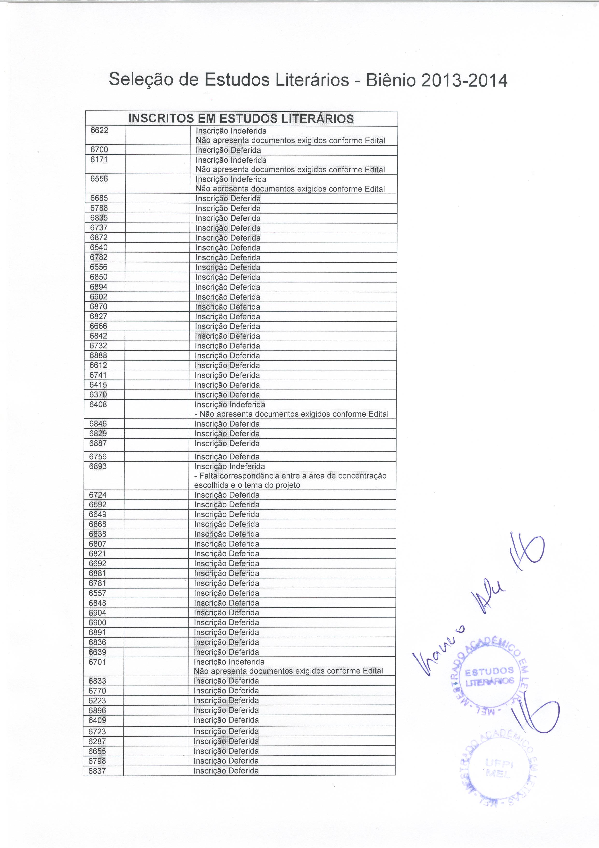 Homologação das inscrições da área de concentração de Estudos Literários