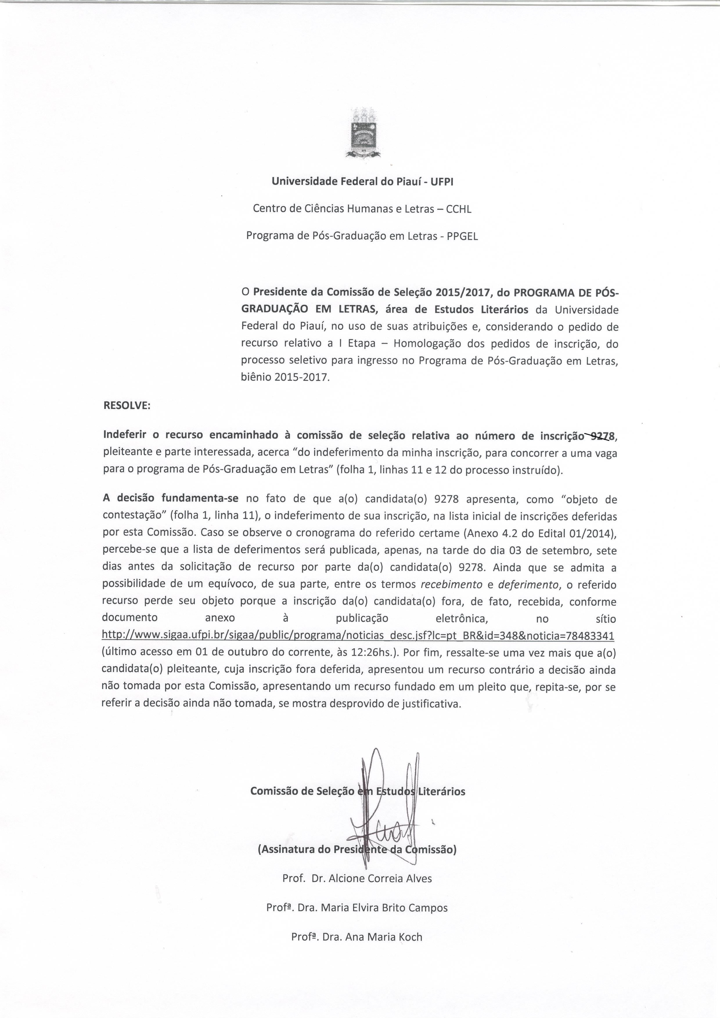 Resposta a recurso Estudos Literários: Inscrição 9278.