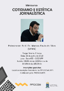 A Universidade Federal do Piauí, por meio do Programa de Pós-Graduação em Comunicação (PPGCOM), convida toda a comunidade acadêmica para o minicurso “Cotidiano e estética jornalística” que será ministrado pelo Prof. Dr. Marcos Paulo da Silva da Universidade Federal do Mato Grosso do Sul (UFMS).