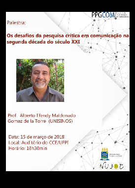 A Universidade Federal do Piauí, por meio do Programa de Pós-Graduação em Comunicação (PPGCOM) DA UFPI, convida toda a comunidade para a palestra “Os desafios da pesquisa crítica em comunicação na segunda década do século XXI” proferida pelo Prof. Dr. Alberto Efendy Maldonado de La Torre (UNISINOS) do Programa de Pós-Graduação em Ciências da Comunicação da Universidade do Vale do Rio dos Sinos (UNISINOS).