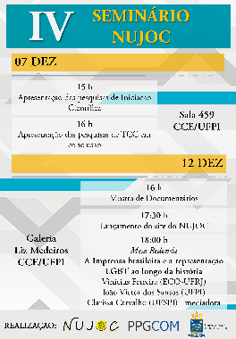 A Universidade Federal do Piauí, por meio do Programa de Pós-Graduação em Comunicação (PPGCOM) DA UFPI e do Núcleo de Pesquisa em Jornalismo e Comunicação (NUJOC), convida toda a comunidade para o IV Seminário do NUJOC.