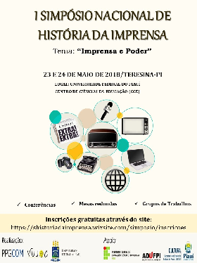 A Universidade Federal do Piauí (UFPI), por meio do Programa de Pós-Graduação em Comunicação Social e do Departamento de Comunicação Social, convida a comunidade acadêmica para participar do I Simpósio de História da Imprensa que será realizado nos dias 23 e 24 de maio de 2018, no Centro de Ciências da Educação (CCE/UFPI), com o tema “Imprensa e Poder”.