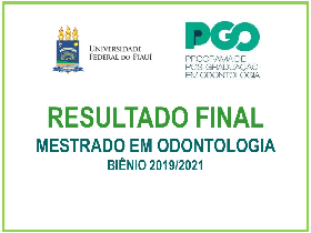 Em anexo o RESULTADO FINAL do processo seletivo referente ao biênio 2019/2021 do Programa de Pós-Graduação em Odontologia (PPGO), Nível Mestrado Acadêmico, conforme edital nº 01/2018 PPGO.