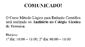 Informamos que Curso Método Lógico para Redação Científica será realizado no Auditório do Colégio Técnico de Teresina, no período de 29 a 30 de março.