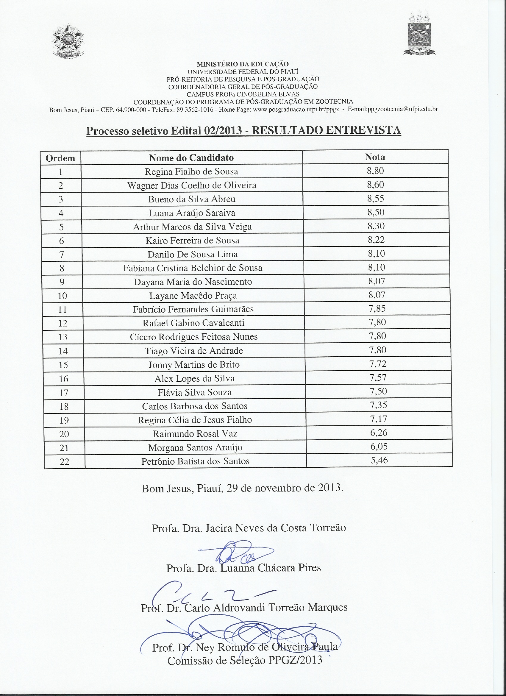 Resultado da ENTREVISTA Processo Seletivo PPGZ/02-2013