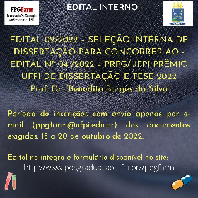 A Coordenação do Programa de Pós-Graduação em Farmacologia da Universidade Federal do Piauí, no uso de suas atribuições, comunica a abertura de processo seletivo interno com vista à indicação de 01 (uma) Dissertação defendida em 2021 ao EDITAL Nº 04 /2022 – PRPG/UFPI PRÊMIO UFPI DE DISSERTAÇÃO E TESE 2022 Prof. Dr. “Benedito Borges da Silva”.