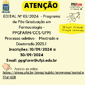 EDITAL N° 02/ (2024) – Programa de Pós-Graduação em Farmacologia PPGFARM/UFPI Processo seletivo Mestrado e Doutorado – ingresso 2025.1