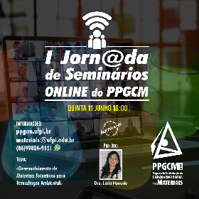 Abertas para o público em geral as inscrições para a 4a. Palestra da I Jornada de Seminários Online do PPGCM a ser realizada todas às quintas, 18 horas, via Webconferência, sendo este próximo Seminário a ser ministrado pela Dra. Luzia Maria Castro Honório, Pós-Doc do PPGCM, cujo título é "Desenvolvimento de Materiais Fotoativos para Remediação Ambiental", dia 11/06/2020.