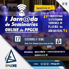 Abertas para o público em geral as inscrições para a 18a. Palestra da I Jornada de Seminários Online do PPGCM a ser realizada na próxima quinta, às 18 horas, via Live do Youtube, sendo este Seminário ministrado pela Profa. Dra. Dinnara Layza Souza da Silva, docente da UESPI, cujo título é "Perspectivas da Utilização da Tecnologia de Plasma na Agricultura", dia 17/09/2020.