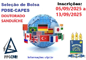 A Coordenação do Programa de Pós-Graduação em Ciência e Engenharia dos Materiais comunica a abertura das inscrições para a  seleção interna de candidatos(as) para bolsa de doutorado sanduíche, no âmbito do Programa de Doutorado Sanduíche no Exterior (PDSE/CAPES), conforme o Edital n° 17/2025 – PDSE/CAPES e Edital nº04/2025 do PPGCM,disponível na página da  Universidade Federal do Piauí (UFPI): ufpi.br e na página da Coordenação de Aperfeiçoamento de Pessoal de Nível Superior (CAPES).