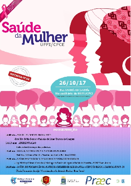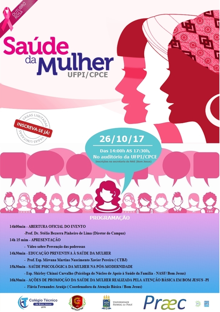 A Universidade Federal do Piauí, por meio da Pró-Reitoria de Assuntos Estudantis e Comunitários (UFPI/PRAEC), do Núcleo de Assistência Estudantil (NAE) – Campus Professora Cinobelina Elvas (Bom Jesus) promove, no auditório do Campus Professora Cinobelina Elvas – CPCE, no dia 26 de outubro de 2017, palestra sobre saúde da mulher. Direcionada a servidores e alunos da UFPI e do Colégio Técnico de Bom Jesus (CTBJ), além da comunidade em geral.
