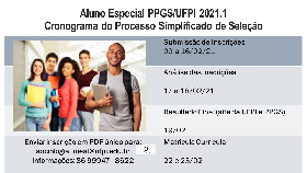 O Programa de Pós-graduação em Sociologia - PPGS da Universidade Federal do Piauí - UFPI torna publico o Processo Seletivo Simplificado para o/as interessado/as em ingressar no periodo 2021.1 como aluno/as em caráter especial do Mestrado, podendo matricularem-se em até duas (02) disciplinas.