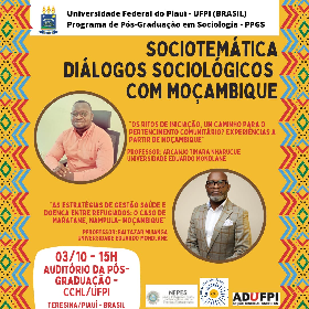 No dia 03/10 às 15h, os convidados participarão do evento “Sociotemática: Diálogos sociológicos com Moçambique”, organizado por Gabriel Eidelwein Silveira (Unipampa/PPGS-UFPI), discutindo os temas: “Os ritos de iniciação, um caminho para o pertencimento comunitário? Experiências a partir de Moçambique” (prof. Arcanjo); e “As estratégias de gestão saúde e doença entre refugiados: o caso de Maratane, Nampula- Moçambique” (prof. Baltazar).
