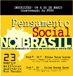 A coordenação do PPGs tem a grata satisfação de convocá-los para palestra da aula inaugural da 4ª turma do mestrado de sociologia, proferida pela  Profrª. Drª. Eliane Veras Soares do Programa de pós-graduação em Sociologia da UFPE, com o tema: Pensamento Social no Brasil: desafios da formação do sociólogo no século XXI. A referida aula ocorrerá no dia 23 de março de 2015, às 14:00h no auditório Noé Mendes no CCHL.as inscrições inicia dia 09 de março, informamos ainda que os participantes receberão declaração de participação do Evento.