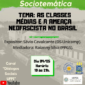 O Programa de Pos-graduação em Sociologia, convida a todos/as para a SOCIOTEMÁTICA, cujo tema é " AS CLASSES MÉDIAS E A AMEAÇA NEOFACISTA NO BRASIL", que terá na mediação a mestranda do PPGS Raianny Silva e exposição do Prof. Dr. da DS - UNICAMP Sávio Cavalcante. É HOJE A PARTIR DAS 19H PELO CANAL "DIÁLOGOS SOCIAIS UFPI" NO YOUTUBE.