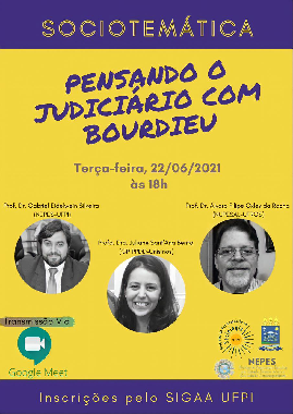 O Programa de Pos-graduação em Sociologia, convida a todos/as para a SOCIOTEMÁTICA, cujo tema é " PENSANDO O JUDICIÁRIO COM BOURDIEU", o evento contará com a participação dos professores doutores Gabriel Eidelwein Silveira (NEPES - PPGS UFPI), Juliane Sant'Ana Bento (GP PPDD-Unisinos) e Álvaro Filipe Oxley da Rocha (NUPESAL - UFRGS). É dia 22 de junho, às 18h00 com transmissão pelo googlemeet. As inscrições são pelo SIGAA UFPI.