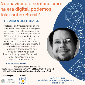 O Núcleo de Pesquisas e Estudos em Estado Democrático e Sociedade Contemporânea (NEPES) e o Programa de Pós-Graduação em Sociologia (PPGS/UFPI) realizam no dia 6 de dezembro, às 16h, a palestra “Neonazismo e neofascismo na era digital: podemos falar sobre Brasil?”. A discussão, que acontecerá no Auditório da Pós-Graduação no CCHL, será ministrada pelo professor Fernando Horta (UnB). As inscrições estão disponíveis, para participar acesse