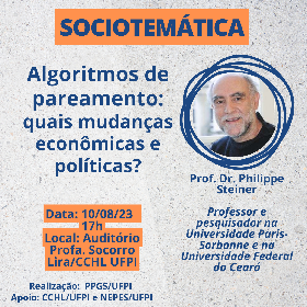 No dia 10 de agosto, o PPGS/UFPI realiza mais uma edição da Sociotemática, recebendo o professor Philippe Steiner (Universidade de Paris-Sorbonne e Universidade Federal do Ceará), estudioso do campo da Sociologia Econômica. O evento é aberto, gratuito, realizado em parceria com o Centro de Ciências Humanas da UFPI (CCHL/UFPI) e o Núcleo de Pesquisas e Estudos em Estado Democrático e Sociedade Contemporânea (NEPES/UFPI). A atividade acontece às 17h, no Auditório Profa. Socorro Lira (CCHL).