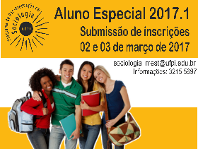 O Programa de Pós-Graduação em Sociologia torna público através deste o processo simplificado para ingresso de discentes em carater especial no período 2017.1 na 6ª Turma de Mestrado em Sociologia, o processo de seleção se dará conforme regulamentação da resolução 01.2013 - PPGS, onde, o candidato/a se apresentará presencialmente ou atraves de um procurador/a com documentos originais e cópias na coordenação do PPGS sala 308B-Centro de Ciências Humanas e Letras-CCHL-UFPI afim de pleitear vaga no processo, conforme a lista da documemntação exigida: