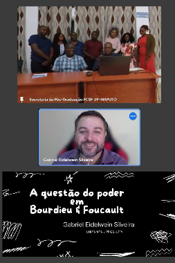 No dia 20/3/24, o Professor Gabriel Eidelwein Silveira (PPGS/UFPI e Unipampa) ministrou a palestra online "A questão do poder em Bourdieu e Foucault" para turma de Mestrado em Sociologia da Universidade Pedagógica de Maputo, Moçambique.