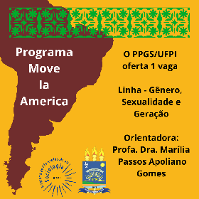 O Programa de Pós-Graduação em Sociologia da Universidade Federal do Piauí (PPGS/UFPI) foi contemplado pelo Programa Move La America (Edital CAPES n. 07/2024), com uma bolsa para discente estrangeire da América Latina e Caribe.  Interessades devem apontar sua escolha pelo PPGS, com vinculação a Linha Gênero, Sexualidade e geração, no Brasil contando com a coorientação da professora Dra. Marília Passos Apoliano Gomes. A referida docente tem atuado principalmente com as seguintes temáticas: Interseccionalidade; Gênero e raça no Brasil; Decolonialidade e contracolonialidade; Direitos humanos e movimentos sociais; Sociologia Urbana e direito à cidade; Memória, identidade e território; Ensino de Sociologia. Atualmente desenvolve pesquisas nas áreas de Feminismos afrodiaspóricos, Memória e Direitos Humanos. E-mail para contato: mariliapassos@ufpi.edu.br