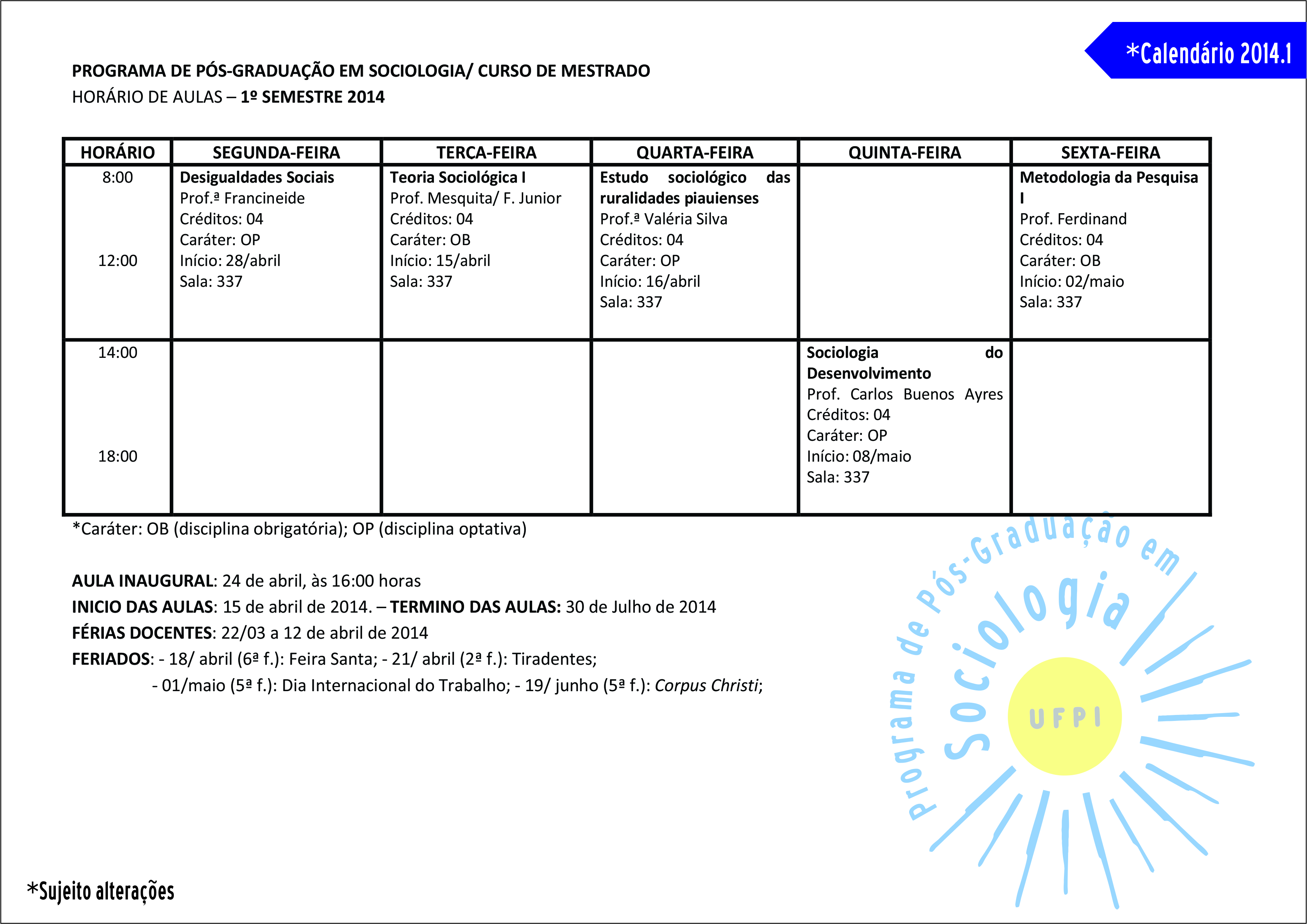 Novo cronograma INICIO DAS AULAS 2014.1