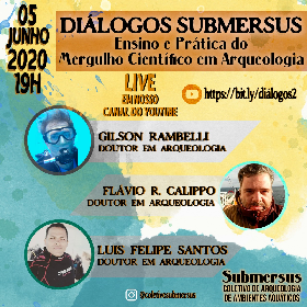 A Submersus – Coletivo de Arqueologia de Ambientes Aquáticos promoverá a transmissão on line da live "Diálogos Submersus: ensino e prática do mergulho científico em Arqueologia", com a participação dos arqueólogos Dr. Gilson Rambelli, Dr. Flávio Rizzi Calippo e o Dr. Luis Felipe Freire Dantas Santos. O projeto Diálogos Submersus, promovido pela Submersus – Coletivo de Arqueologia de Ambientes Aquáticos, é uma iniciativa científica colaborativa, sem fins lucrativos, que agrega pesquisadoras e pesquisadores que lidam com as diferentes vertentes da pesquisa arqueológica em ambientes aquáticos e do universo aquático. A proposta do nosso projeto é a difusão do conhecimento arqueológico produzido pelas pesquisas das(os) pesquisadoras(es), buscando com isso a popularização da ciência e o compartilhamento com a sociedade do patrimônio cultural subaquático. Através de transmissões ao vivo pelo nosso canal do Youtube, iremos realizar debates de temas e pesquisas arqueológicas, possibilitando a participação do público.O evento ocorrerá dia 05/06/2020, às 19:00, no Canal do Coletivo Submersus no Youtube (https://bit.ly/coletivosubmersus) - Diálogos Submersus #2 - Ensino e Prática do Mergulho Científico em Arqueologia (https://bit.ly/diálogos2). No instagram: @coletivosubmersus.