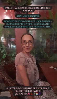 O PPGArq comunica que no dia 29 de novembro, às 10 horas, a professora Lina do Carmo, fará uma palestra sobre a temática "ARQUEOLOGIA COMO UM GESTO CRIADOR". Aberta à comunidade acadêmica, sem necessidade de inscrição, a apresentação ocorrerá no Auditório do Museu de Arqueologia e Paleontologia da UFPI.